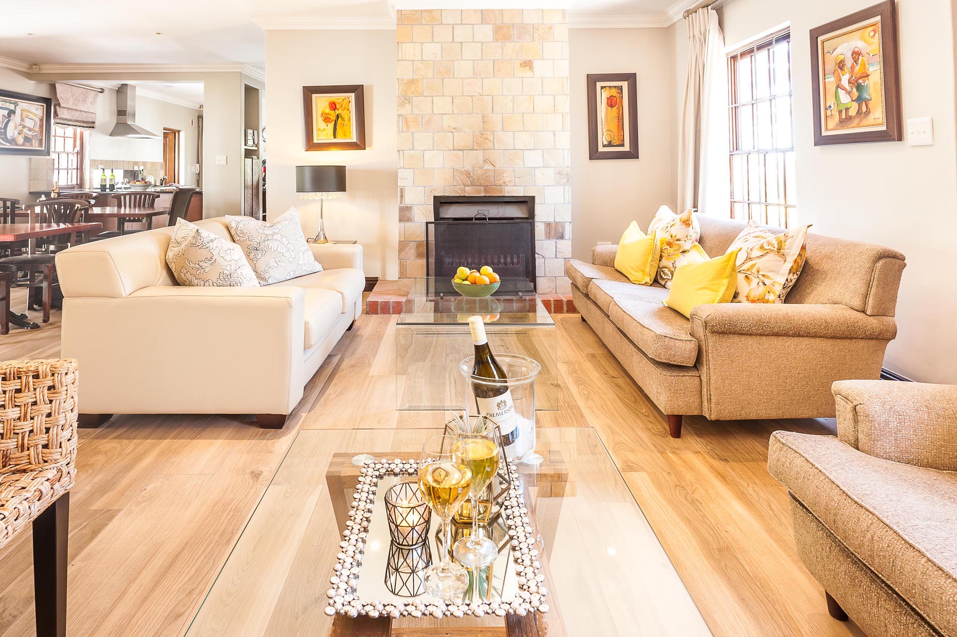 The ground floor offers several different areas where guests can relax. A double sided glass door fireplace takes centre stage and will welcome you with a roaring log fire in winter. Step outside into a tranquille, landscaped